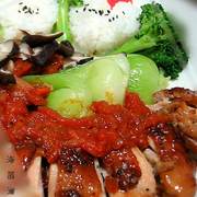 鸡腿、洋葱、西红柿、配菜、盐、黑胡椒碎、迷迭香、番茄酱、生抽。