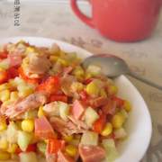 金枪鱼罐头、甜玉米粒、黄瓜、火腿、红椒、盐、白胡椒粉、柠檬汁、罐头里的油、白糖、番茄沙司。