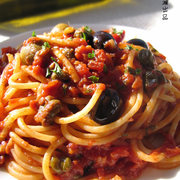 水管面、鳀鱼、黑橄榄、绿橄榄、红辣椒、醋渍酸豆、荷兰芹、帕马森干酪、番茄酱汁、白葡萄酒、鸡高汤、蒜香橄榄油、初榨橄榄盐、油、胡椒。