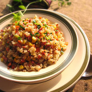 米饭、黄瓜、胡萝卜、甜玉米粒、酱牛肉丁、小香葱、黑胡椒碎。