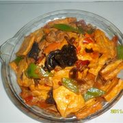 豆腐、猪肉、尖椒、木耳、胡萝卜、郫县豆瓣酱、盐、老抽、鸡精、淀粉、糖、葱、姜、蒜。