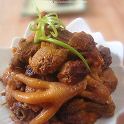 三黄鸡、鲜鸡脚、姬松茸、姜、米酒、生抽、老抽、盐、糖。