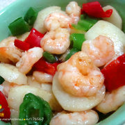 马蹄、基围虾、红椒、青椒、料酒、盐、生粉。