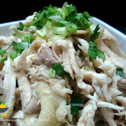 鸡、大葱、姜、盐、鸡精、沙姜粉、芝麻油、香菜、熟芝麻。