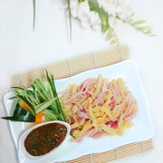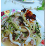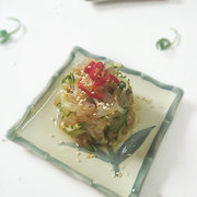 海蜇头、黄瓜、紫天椒、蒜、凉拌汁、陈醋、生抽、鸡精、香麻油、白糖。