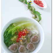 牛筋丸、河粉、生菜、蒜、紫天椒、芹菜、上汤、盐、鸡精。
