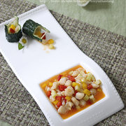 玉米笋、鸡胸肉、黄椒、红椒、豉油鸡汁、生粉、鸡精、盐、香油、姜、蒜。