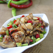 田鸡、泡椒、红椒、青椒、蒜苔、淀粉、泡椒。
