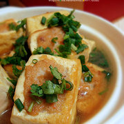 豆腐、瘦肉、鱼肉、虾米、香菇、蒜苗、葱、姜、鸡蛋、葱、姜、蒜粉、胡椒粉、麻油、盐、鸡精、鸡汁、生抽、淀粉。