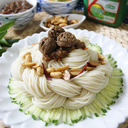 一町拉面、黄瓜、胡萝卜、黄飞红麻辣花生、欣和豆瓣酱、上肉、潮汕牛肉丸、沙葛、大葱、鸡蛋、香油、盐。
