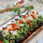 辣椒叶、梅柳肉、姜、鸡汁、盐、生粉、香油。