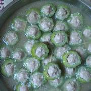 苦瓜、猪肉、姜、生抽、五香粉、盐、味精、生粉、香麻油、蒜。