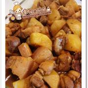 带皮五花肉、鸡腿、土豆、葱、姜、蒜、大料、香叶、生抽、老抽、糖、料酒。