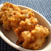 水煮玉米粒、圆葱、调的糊、油、盐、胡椒。