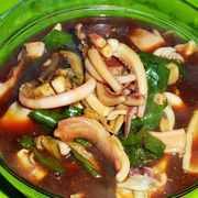 鱿鱼、蘑菇、绿辣椒、葱、蒜、姜、盐、糖、老抽、生抽、淀粉。