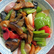 五花肉、茄子、豆角、蕃茄、土豆、洋葱、青椒、葱、姜、八角、料酒、黄豆抽、盐、鸡精。