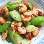 丝瓜、虾、姜、蒜、料酒、白糖、盐、鸡精。