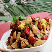 鸡胸肉、冬笋、木耳、葱、姜、蒜、泡红椒、小米椒。