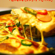 高筋面粉、低筋面粉、干酵母粉、温水、黄油、橄榄油、蛋黄、香肠、青红椒、马苏里拉、番茄酱、披萨草、盐、砂糖、意大利综合香料。