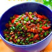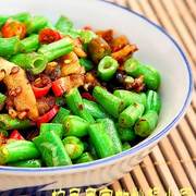 肥肉、四季豆、红色朝天椒、干尖椒、生姜、盐、鸡精、胡椒粉、老干妈。