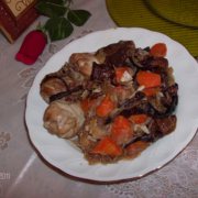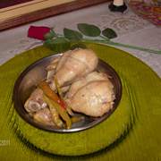 鸡腿、榛蘑、油、姜粉、葱、蒜、盐、八角、生抽、红酒、糖、花椒。
