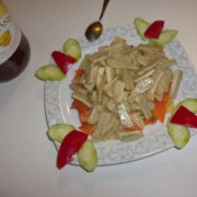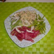 黄瓜、青椒、西红柿、大蒜、熟鸡肉丝、芝麻酱、果醋、橄榄油、盐。