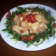 菜花、香菜、红辣椒、色尖椒、鸡蛋、盐、豆油、土豆粉、番茄酱、白糖。