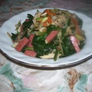 菠菜、火腿、鸡腿肉、辣椒、洋葱、葱、蒜、姜粉、胡萝卜、盐、豆油。