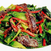 油麦菜、罐装豆豉鲮鱼、红菜椒、大蒜、鸡精、盐。
