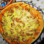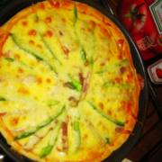 火腿、洋葱、青椒、面团、马苏里拉芝士、亨氏番茄酱。