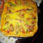 面团、风干肠、火腿肠、马苏里拉芝士、油、洋葱、青椒、亨氏番茄酱。