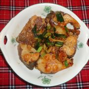 大头鱼尾巴、油、盐、鸡精、酱油、地瓜粉、姜、蒜。