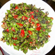 四季豆、猪肉、橄榄菜、小米椒、生姜、大蒜、油、盐、生抽、料酒、鸡精、生粉。