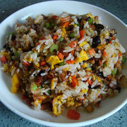 米饭、鸡蛋、小金钩、干香菇、芹菜、胡萝卜、大蒜头、小鱼粉。