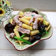 玉米笋、木耳、猪枚肉、葱、淀粉水、盐、糖、生抽、油。