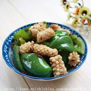 鲜鱿、菜椒、阳江即食豆豉、姜、独蒜、淀粉水、生抽、糖、花雕酒。