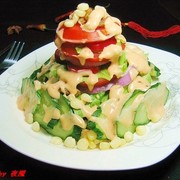 生菜、黄瓜、番茄、红柿子椒、洋葱、玉米、葡萄干、丘比千岛酱。