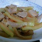 西瓜皮、肉片、盐、料酒、淀粉、生抽、鸡精、葱蒜末。