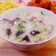 大米、松花蛋、猪瘦肉、双汇小烤肠、生菜、盐、鸡精、香油、面碱。