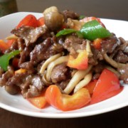 牛肉、红甜椒、蟹味菇、蒜蓉、绿尖椒、盐、白酒、地瓜粉、蚝油。