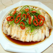石斑鱼、青葱、红尖椒、生粉、姜片、盐、白酒、李锦记蒸鱼鼓油。