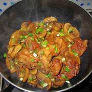 鸡块、蘑菇、大葱、生姜、葱花、酱油、料酒、茴香、八角、桂皮、朝天椒。