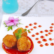 鸡肉、面包糠、鸡蛋、水、油、盐、黑胡椒粉、白朗姆酒、蛋清、淀粉、白糖、白醋、蕃茄酱。