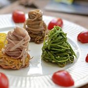 通心粉、火腿、苦菊、紫甘蓝、沙拉酱、橄榄油、黑胡椒粉、盐。