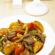芸豆、猪肉、土豆、胡萝卜、开水、料酒、淀粉、洋葱、蒜、酱、鸡精、油、盐。