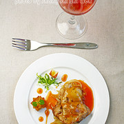 鸡腿肉、土豆、苦菊、苹果、橄榄油、盐、黑胡椒粉、洋葱、迷迭香、白糖、红酒、浓缩橙汁。