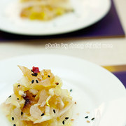蜇头、白菜、熟芝麻、红椒、水、盐、鸡精、白糖、白醋、香油、麻油、芥末油。