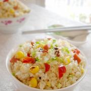 剩饭、火腿、玉米粒、鲜蘑菇、鸡蛋、香葱、油、盐、剁椒。