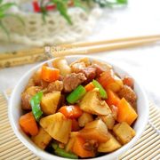 面筋、猪肉、胡萝卜、蒜、青椒、红椒、食油、盐、生抽、郫县豆瓣酱。