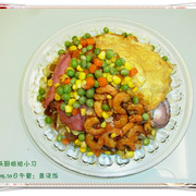米饭、牛肉、青豆、包菜、虾仁、鸡肉、玉米粒红萝卜丁、鸡蛋、洋葱、蛇豆、豆芽、青椒、盐、酱油、蚝油、鸡精、花椒面。